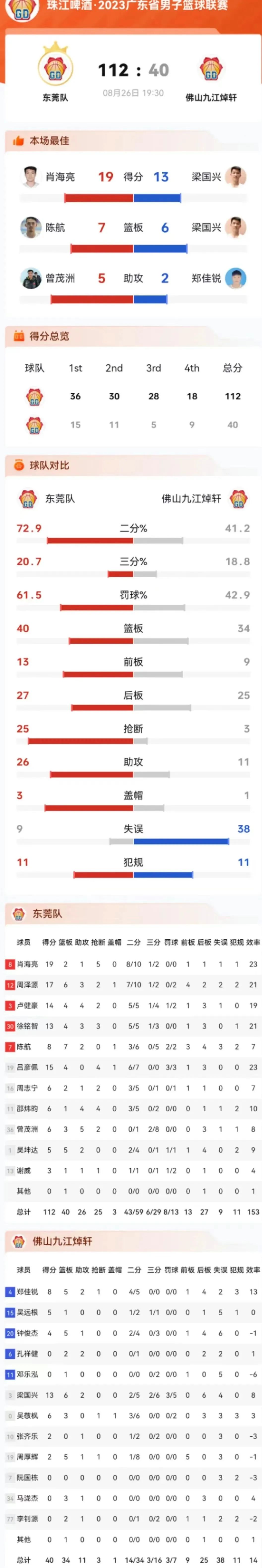 下半场比赛开始,佛山队调整心态继续再战,重整旗鼓。虽然也是打出了一波士气,但是仍然没能破解东莞队的紧密防守。东莞队也是手感火热,状态依然在线,把分差进一步拉大四十分。来到末节,比赛已经毫无悬念,佛山队已然竭尽全力,最终东莞队大比分拿下比赛,