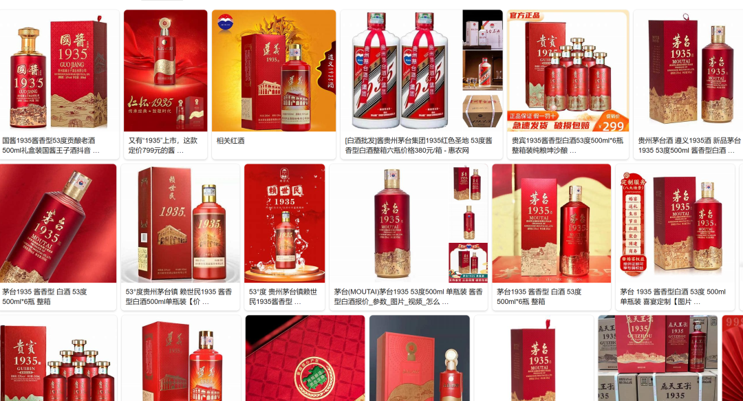 1935可能这两年最火的一组数字啦。茅台为纪念1935年在遵义召开的遵义会议而在遵义1935的基础上改版推出了茅台1935,本身做的是一款纪念酒,因为茅台1935的爆火很多品牌开始效仿。仁怀1935、多彩贵州1935、红军渡1935、红赤渡1935、成义烧坊1935、潭酒1935、红四渡1935、金沙古酒1935、东泰遵义1935、黔北魂遵义1935、赖世家1935年、中盛1935、国酱1935、酱香领袖1935、黔朝1935等等。