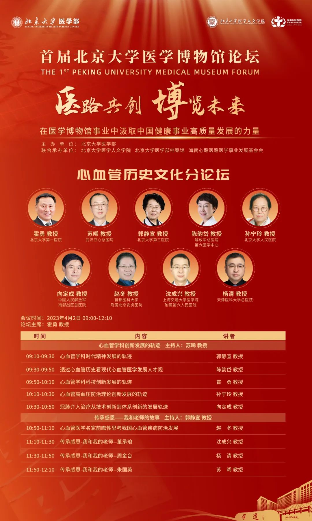 论坛将邀请众多医学专家、博物馆专家、历史学家、企业家等各界代表共襄盛举,将举办心血管、血液、呼吸等学科平行论坛,策划“溯医史·博未来”主题展览,其中心血管历史文化分论坛将于4月2日上午9点召开,会议邀请多个心血管领域专家大咖,从多个角度分享心血管发展的创新轨迹。