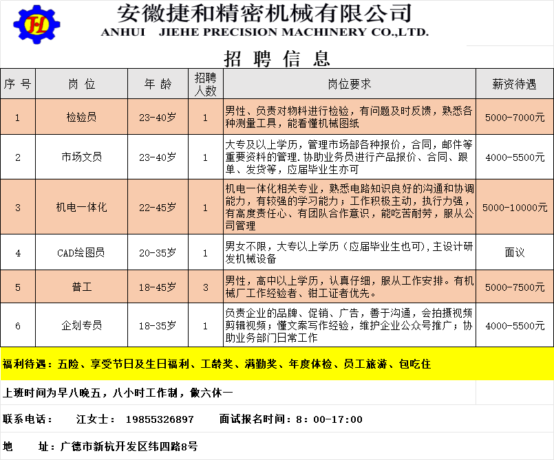 安徽捷和精密机械有限公司【招检验员+市场文员+机电一体化+CAD绘图员+普工+企划专员】