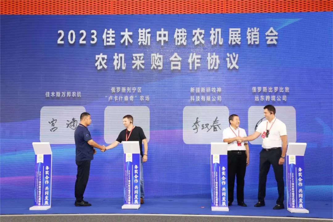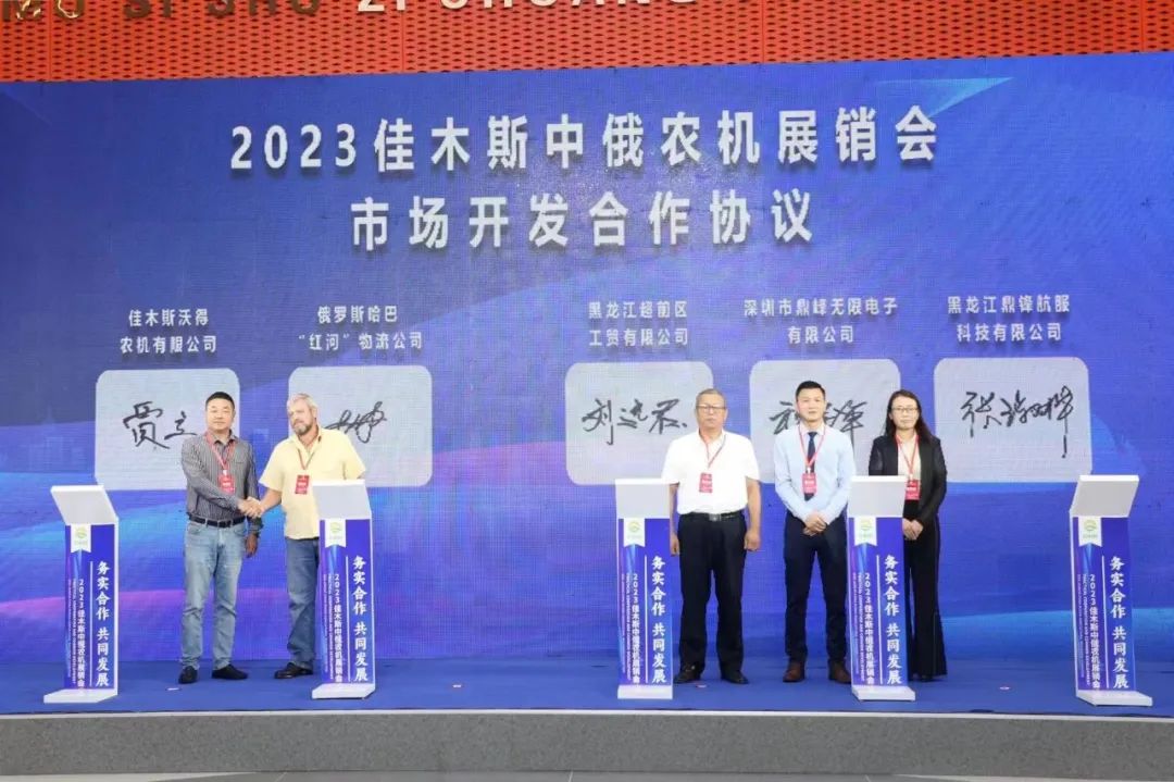 开幕式上,佳木斯万邦农机、新疆新研牧神科技有限公司分别与俄罗斯列宁区“卢卡什维奇”农场、俄罗斯比罗比詹远东跨境公司签署农机采购合作协议;佳木斯沃得农机有限公司、黑龙江超前区工贸有限公司分别与俄罗斯哈巴“红河”物流公司、黑龙江鼎锋航服科技有限公司、深圳市鼎峰无限电子有限公司签署市场开发合作协议。