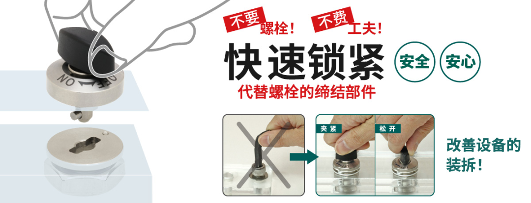 快速锁紧是代替螺栓来进行缔结的部件。代替螺栓,便能无需工具进行快速操作,从而提高工作效率。尤其适用于需要频繁装拆之处,从而改善整体的装拆效率。此外,快速锁紧系列各型号的操作都相当简单,锁紧力不会受到操作人员个人力量偏差的影响。