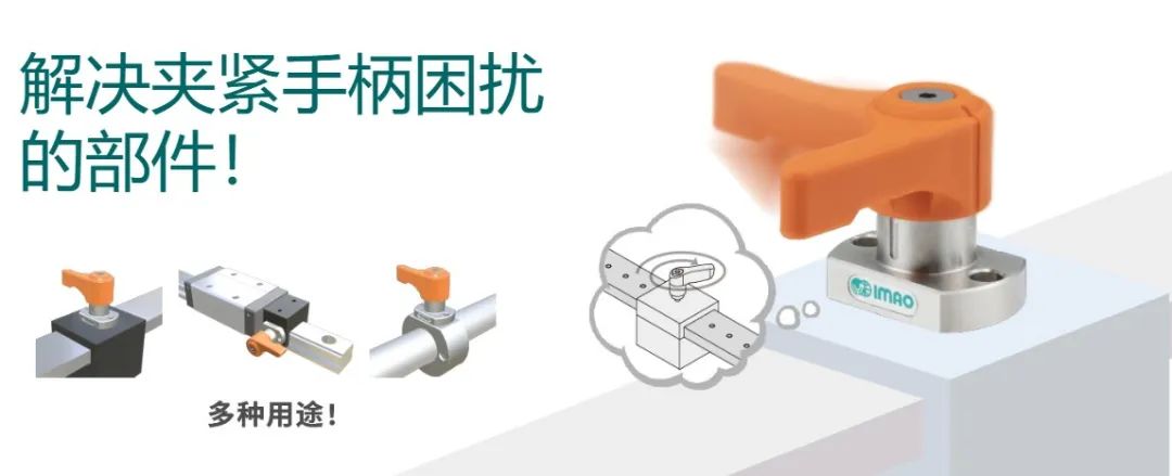 您是否为滑动调整,角度分度等生产项目发生变化时如何固定配件的问题所困扰?即使可以通过使用夹紧手柄能实现无工具化的操作,但仍然存在因不同操作工人之间的紧固程度不一致、忘记拧紧以及转动螺栓耗费工夫的问题。