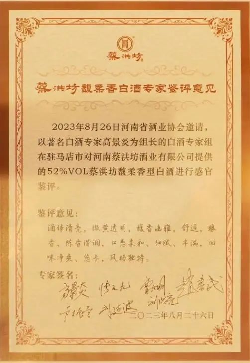 "酒体清亮,微黄透明,馥香优雅、舒适,粮香、陈香谐调,口感柔和、细腻、丰满,回味净爽、悠长,风格独特"的感官质量品评和行业鉴定结论,并在蔡洪坊馥柔香白酒品鉴证书上依次签名。在品评会的最后,高景炎、赵书民等白酒专家即席挥毫,为蔡洪坊酒业留下珍贵墨宝。