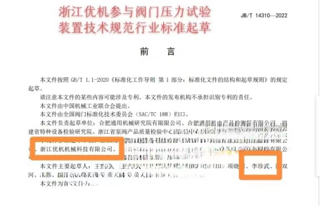 近期,由中华人民共和国工业和信息化部发布,中华人民共和国机械行业标准JB/T14310--2022。本标准按照GB/1.1-2020《标准化工作导则第1部分:标准化文件的结构和起草规则》的规定起草。本标准由中国机械工业联合会提出。本标准由全国阀门标准化技术委员会(SAC/TC188)归口。本标准由合肥通用机械研究院有限公司等牵头,浙江优机机械科技有限公司等参与起草。本标准为首次发布,发布时间为2022年9月30日,实施时间为2023年4月1日。本标准的范围,本文件规定了阀门压力试验装置的结构型式,技术要求,试验方法,出厂检验,以及标志、使用说明书、包装、运输和贮存。该标准件适用于公称压力不超过PN400、压力等级不超过Class2500,法兰连接端、焊接连接端、对夹连接端阀门压力试验装置的制造。本标准规范性引用文件,下列文件中的内容通过文中的规范性引用而构成本文件必不可少的条款。其中,注日期的引用文件,仅该日期对应的版本适用于本文件;不注日期的引用文件,其最新版本(包括所有的修改单)适用于本文件。GB/T2878.3 液压传动连接 带米制螺纹和0形圈密封的油口和螺柱端 第3部分:轻型螺柱端(L系列)GB/T 3766 液压传动系统及其元件的通用规则和安全要求GB/T 5226.1机械电气安全 机械电气设备 第1部分:通用技术条件GB 11118.1液压油(L-HL、L-HM、L-HV、L-HSL-HG)GB/T 204381 电气/电子/可编程电子安全相关系统的功能安全 第1部分:一般要求JB/T 6147 试验机包装、包装标志、储运技术要求浙江优机机械科技有限公司阀门压力试验机吸取了二十来年在当今行业各领域的应用经验,如阀门生产厂检,管道安装二检,第三方公检,石化、火电、核电、化工、海军舰艇终端应用,实现协同创新,拓展自身产品和技术的应用场景,这一生态系统是培育现代科技型企业的宝贵土壤。长期以来,浙江优机机械科技有限公司加快关键核心技术攻关,以创新引导发展,基础工艺的迭代和突破创新,不断提高产品的选材创新和试验台智能化融入度,保障完善的售前采集、售时修正、售后运维的三维服务。产品创新的过程中先后迭代开发出3项发明专利和十几项新型实用专利及两项软件著作权,其中绝缘接头压力试验机入围2021年省级先进制造业首台套,还有5个产品入围省级工业新产品,多个产品通过国家阀门检测中心检测。随着我国阀门工业不断发展壮大,对阀门和标准化生产和检测要求不断提高,为此,浙江优机机械科技有限公司将聚焦阀门检测设备产业配套设备相关细分设备,在阀门检测和研磨加工设备产业链循环中,补实产业链的关键节点,为我国阀门检测设备产业提供更加安全可靠的专业设备做出自己的贡献。