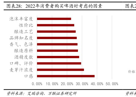 消费者在购买啤酒时,最优先考虑的因素是口感,占比高达81%,其次是价格,占比53%,品牌因素则为42%。生产日期、酒精度、知名度等因素在30-40%的范围内。
