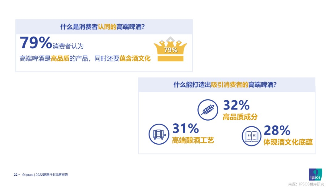根据知名市场研究公司益普索发布的《2022啤酒行业观察报告》显示,中国消费者认为,高端啤酒不仅需要高品质的产品,还需要融入酒文化。只有这两者的完美融合,才能真正传达高端啤酒的价值感。