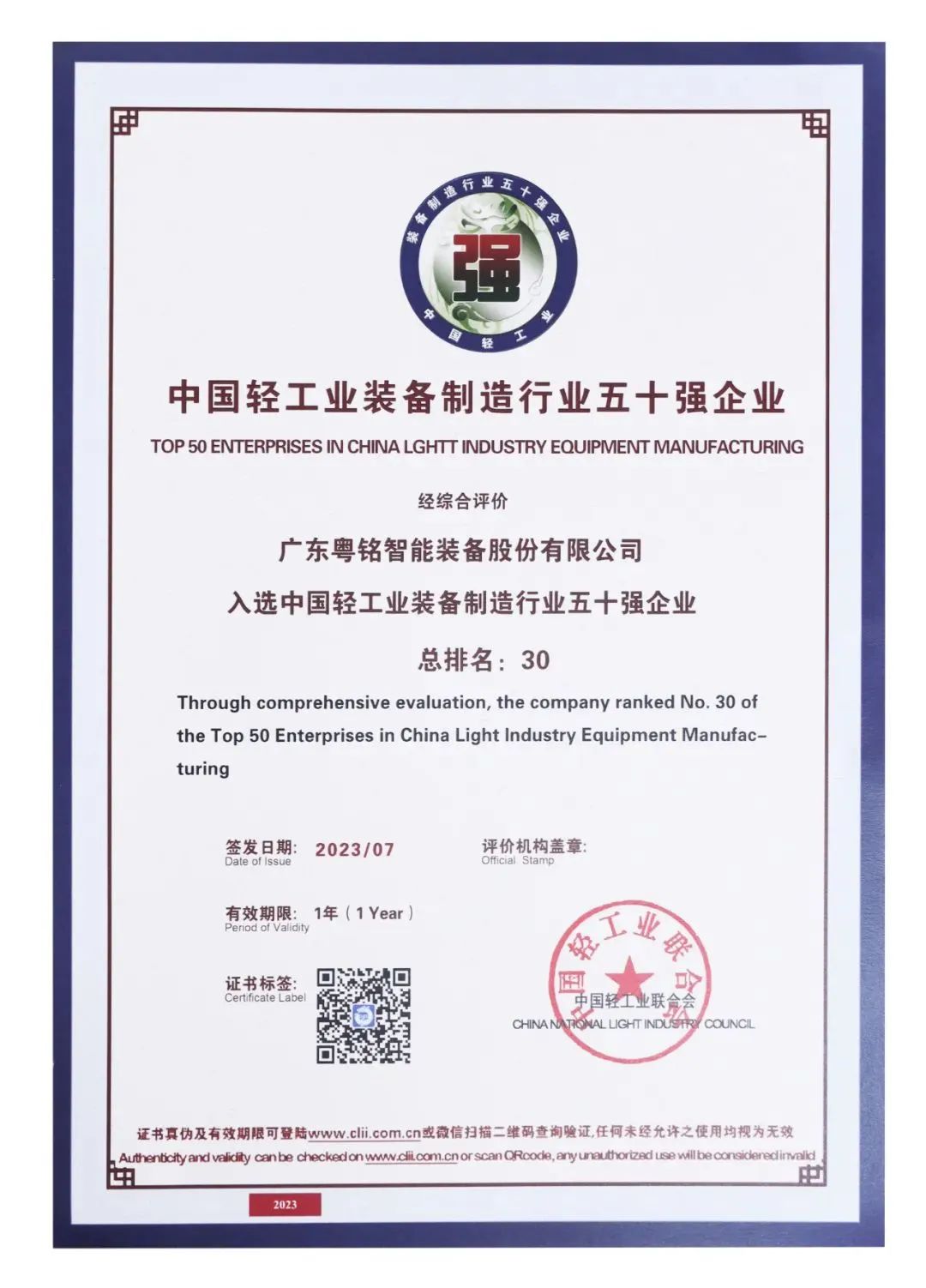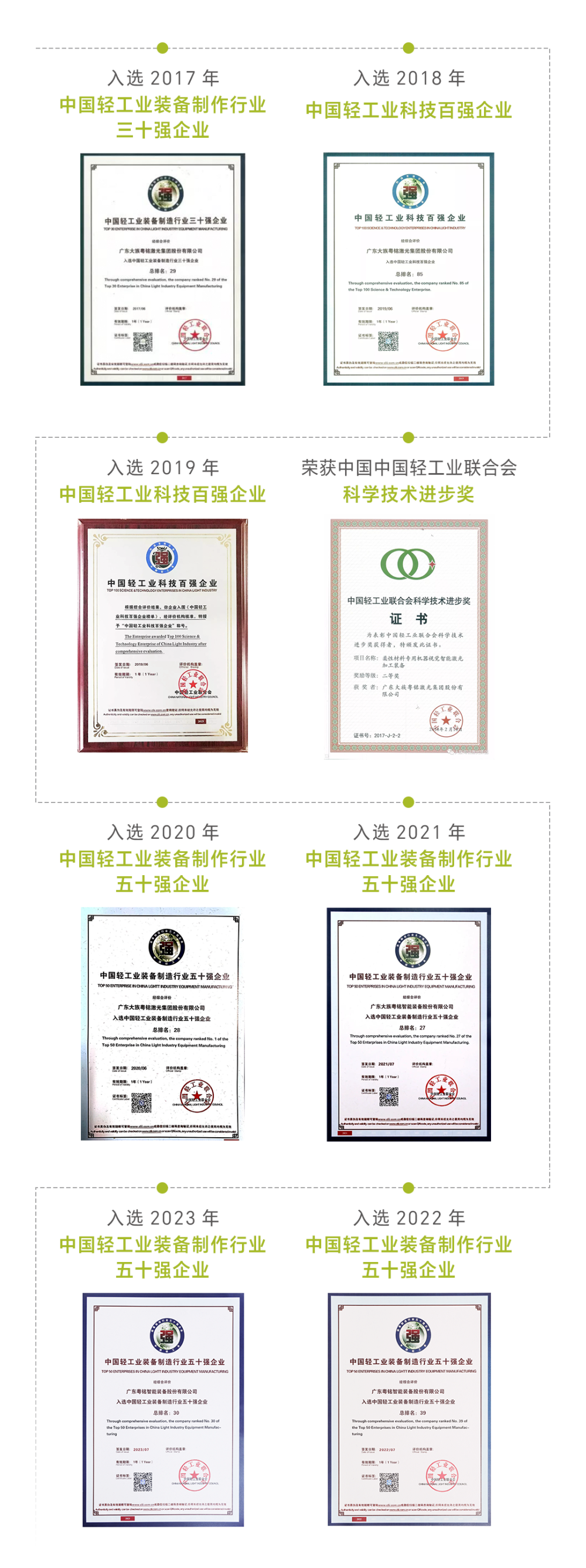 近日,中国轻工业联合会发布了2022年度中国轻工业装备制造行业五十强企业评价结果,广东大族粤铭激光集团股份有限公司旗下子公司“广东粤铭智能装备股份有限公司”再次成功上榜。凭借雄厚的企业实力和强大的行业影响力,粤铭激光集团及旗下子公司连续多年获评“中国轻工业装备制造行业五十强企业”、“中国轻工业科技百强企业”等荣誉称号,充分证明了集团在轻工业领域的综合实力稳居行业领跑地位。