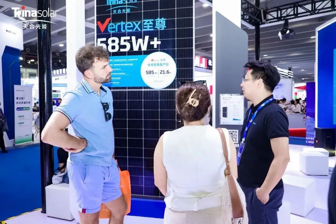 主要用于工商业场景和复杂地形地面电站的“黄金尺寸”至尊N型605W系列组件和至尊585W系列组件也备受观展客户认可。去年4月,天合光能创新性推出210R产品,一举打开全行业矩形硅片创新之门。至尊N型605W组件叠加先进的N型i-TOPCon电池技术,引领电站场景全面迈入N型600W+时代。而至尊585W组件,凭借极致的组件尺寸,可以在工商业屋顶有限的面积下,更加灵活的排布,更高的发电量,造就了工商业更低度电成本典范。