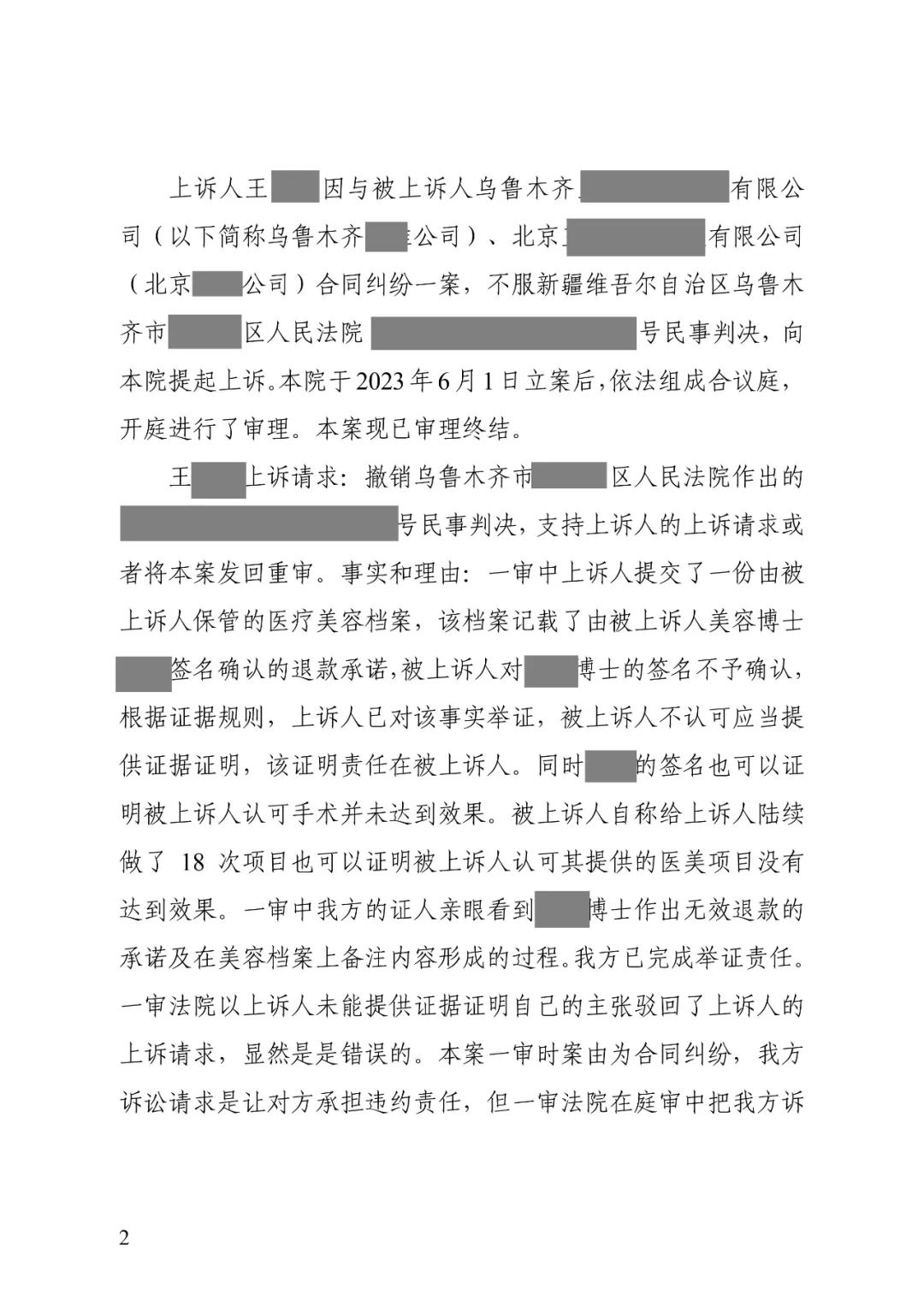 案情主要为:2019年3月,王某在乌鲁木齐某公司处进行医疗美容,乌鲁木齐某公司按照约定完成其美容项目。2019年3月至2020年3月期间,王某共计向该公司大股东北京某公司支付费用149,800元。术后,王某认为手术并未达到预期效果,遂提起诉讼要求乌鲁木齐某公司和北京某公司共同退还王某支付的全部款项。