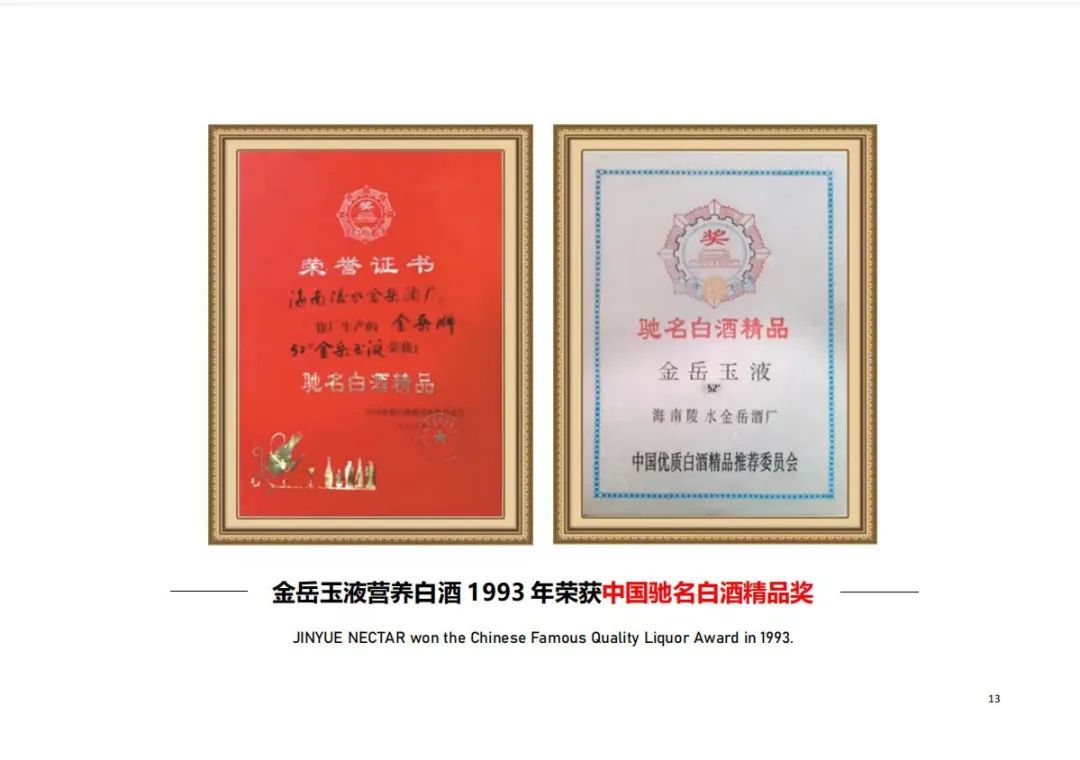 “金岳玉液”酒,以名酒中的陈年老窖为基酒,溶合该厂提取的活性氨基酸生产的营养型滋补白酒。此酒,酒体爽静,酱香突出,味道醇和,细腻优雅。中外著名发酵科学权威秦含章教授赞誉该酒:“琼崖宝岛涌琼浆,玉液神露惊玉皇,五指红娘拂袖笑,九洲白发沾荣光”。首都保健营养美食学会会长、中商部食品检测科学研究所刘仪初先生赞誉该酒为:营养型“茅台酒”。“金岳玉液”酒于 1993 年 8 月荣获首届新加坡国际名优产品博览会最高金奖,同年 10 月又获中国驰名白酒精品奖。