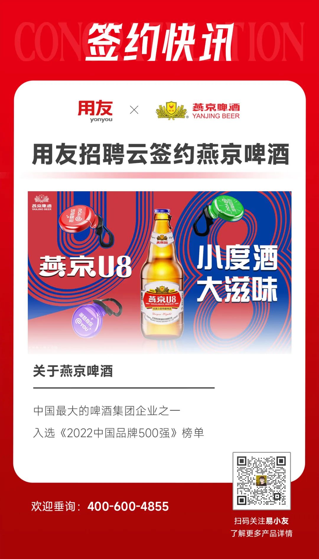 近日,用友招聘云成功签约北京燕京啤酒股份有限公司 (以下简称「燕京啤酒」),共同打造标准化&一体化的线上化招聘平台,推动人力资源数字化转型进程,为企业吸纳高质量人才。