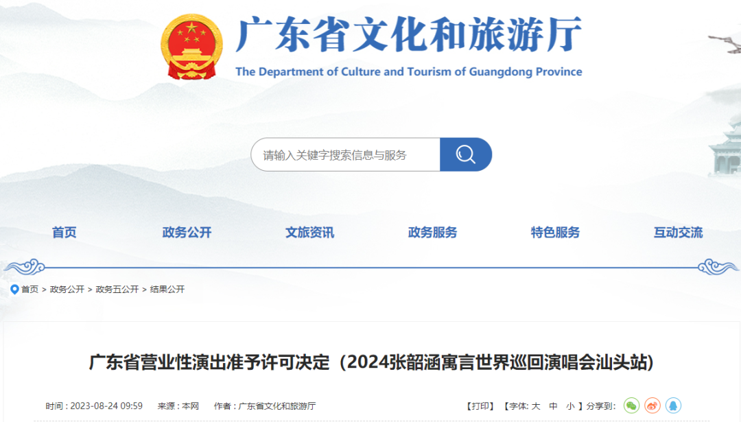 近日,广东省文化和旅游厅发布广东省营业性演出准予许可决定(2024张韶涵寓言世界巡回演唱会汕头站)。