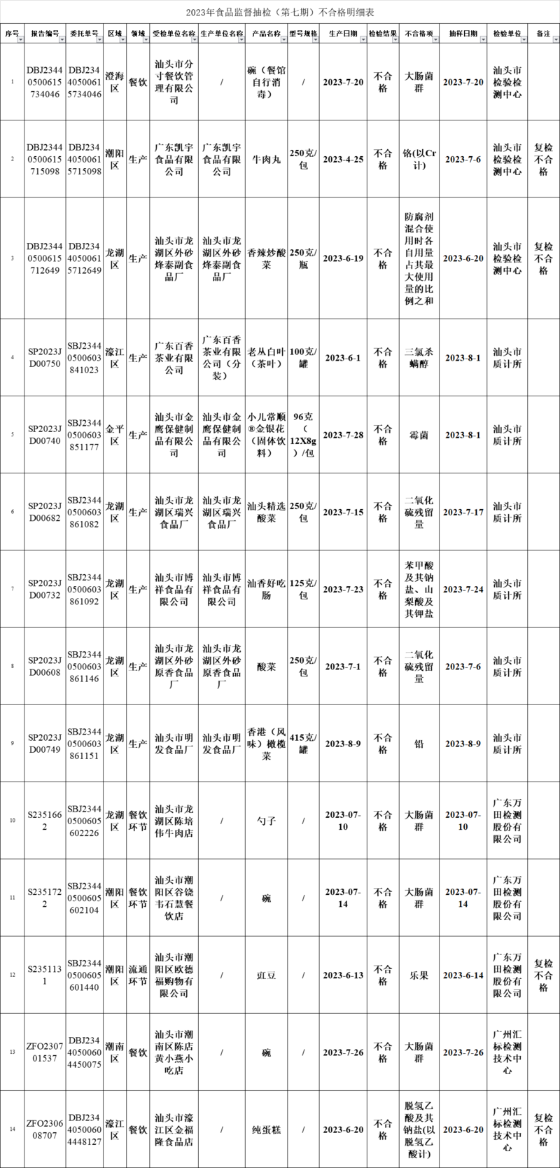 汕头市市场监督管理局对全市辖区内的食品企业生产、流通、餐饮等环节进行食品安全监督抽样检验,从2023年6月25日至8月14日共完成食品抽检966批次,952批次合格,14批次不合格,合格率为98.55%。