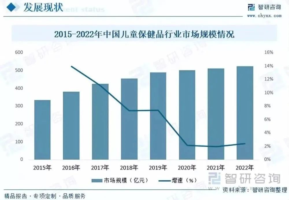 随着我国经济的快速发展,居民生活水平的提升,人们对于自身健康也愈发重视,家长对孩子的营养及保健消费支出也不断增长。同时,在我国二胎、三胎政策的相继开发下,我国儿童人口不断增长,为儿童保健食品行业的发展带来了庞大的需求市场,推动了我国儿童保健食品行业的发展。据资料显示,2022年我国儿童保健食品行业市场规模为523.7亿元,同比增长2.4%。