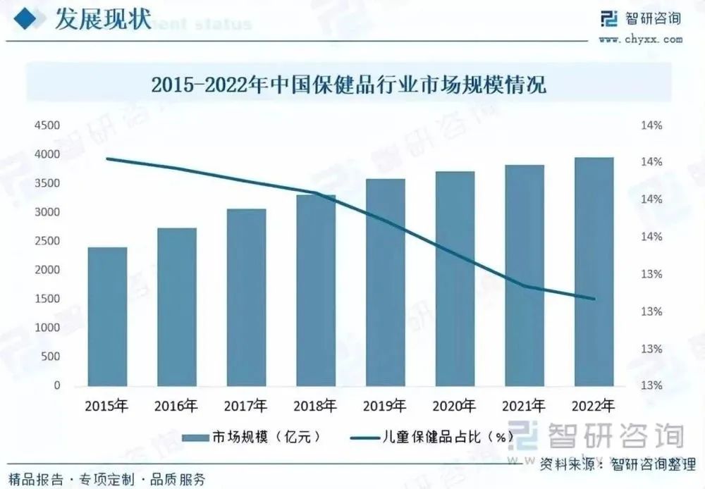 随着近年来我国经济的不断发展,健康中国理念的不断推行,人们对健康的愈发重视。同时,随着我国人口老龄化程度的不断加深,老年人群体的比重越来越高,使得健康、营养、个性、便捷等成为大众关注的热点,保健食品行业也随之快速发展。据资料显示,2022年我国保健食品行业市场规模为3946.8亿元,同比增长3%。其中儿童保健食品占比为13.27%。