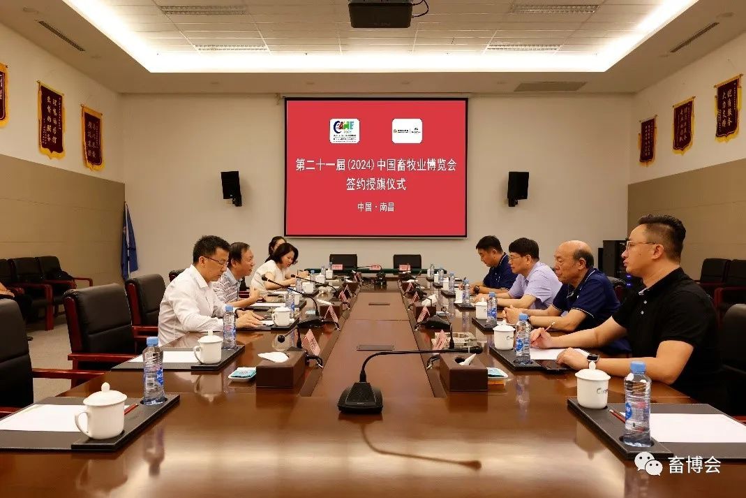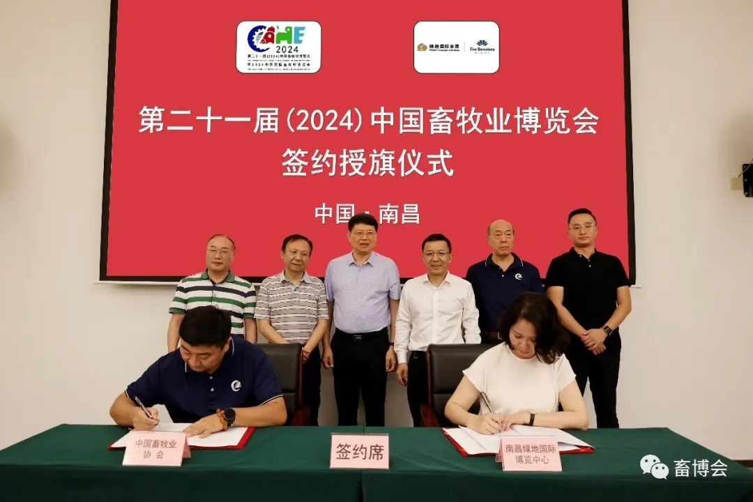 8月23日,中国畜牧业协会副秘书长沙玉圣(主持工作)、常务副秘书长殷成文、会展部主任杨平、副主任曹展一行赴南昌绿地国际博览中心签订第二十一届(2024)中国畜牧业博览会暨2024中国国际畜牧业博览会(以下简称“2024畜博会”)合作协议,并举行了授旗仪式。南昌市会展办主任胡星、副主任喻欣荣,南昌绿地国际博览中心总经理肖家湖、副总经理罗文玲等共同参加相关活动。南昌会展办胡星主任首先感谢中国畜牧业协会对南昌会展办和南昌绿地国际博览中心长期以来的支持与厚爱。2021年,畜博会首次在南昌举办,在疫情、暴雨及满馆使用的巨大压力下,南昌市政府高度重视,成立驻场专班,协调交警、城管、公安、消防等多个部门,有效保障了展会的成功举办,为南昌顺利开展超大型展会积累了成功经验,并奠定了良好的基础,也成为南昌对外招展的响亮名片。2024畜博会再次落地南昌,南昌市政府在以往成功经验的基础上,在政务保障和资金支持等各方面将继续加大力度,全力保障大会顺利召开,让所有展商及观众高兴而来,满意而归。南昌绿地国际博览中心肖家湖总经理表示,作为落地执行方,展馆对于畜博会的再次到来深表荣幸,感谢组委会的充分信任。近两年,展馆积累了丰富的服务超大型展会的经验,尤其是拥有2021畜博会成功举办的经验。2024畜博会,展馆方定将全力做好各种预备方案,完善不足,与组委会携手同心、密切沟通,全力保障大会各项工作顺利开展,再创畜博会在南昌展览的辉煌。