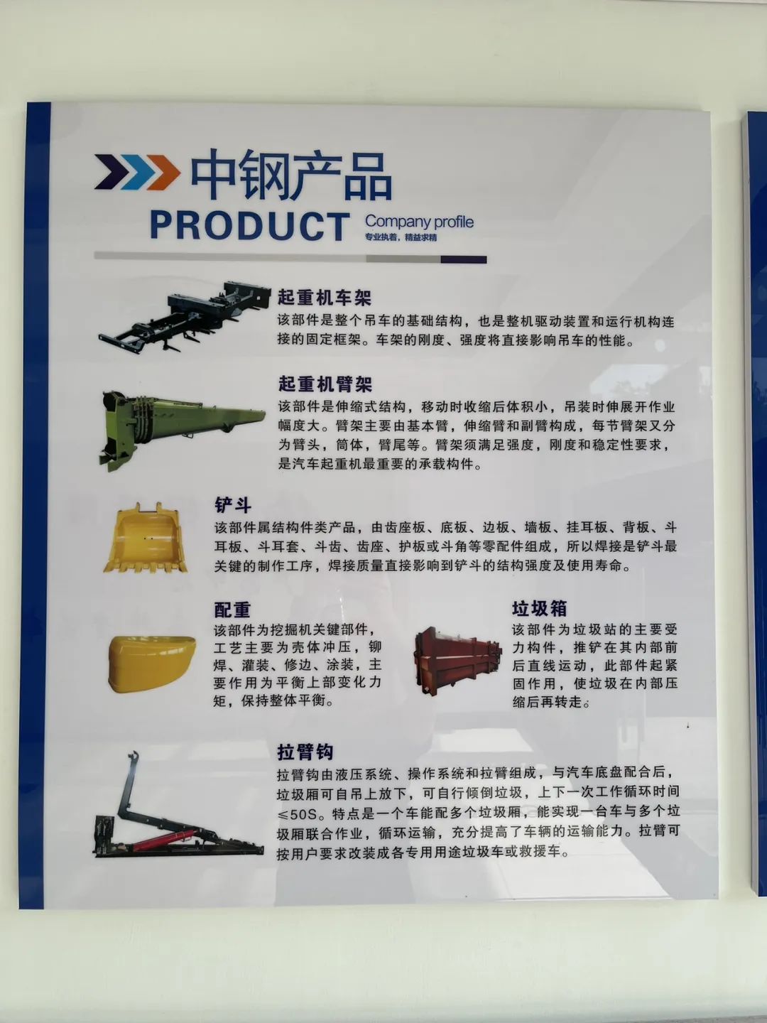 现在企业有400多名工人,有3条环卫生产线、2条车架生产线、1条钩臂生产线。生产线上分布着等离子切割机、数控火焰切割机等大中型设备530多台套,拥有 7 个发明专利, 31个实用新型专利。