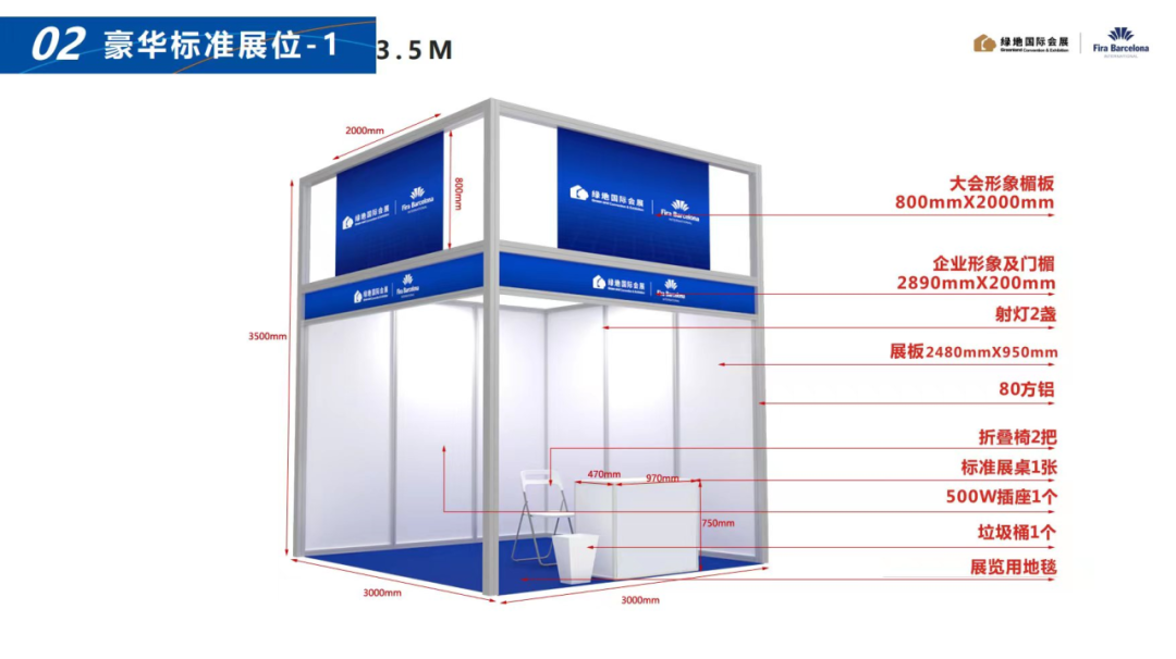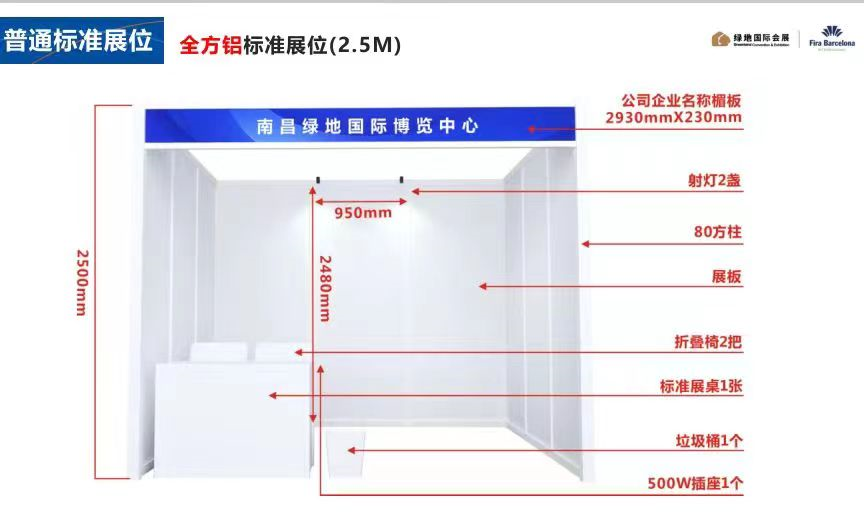 ● 展位配置:三面围板(双开口两面)、楣板1条(双开口2条)、220V/5A电源1个、1桌2椅、长臂射灯2支。