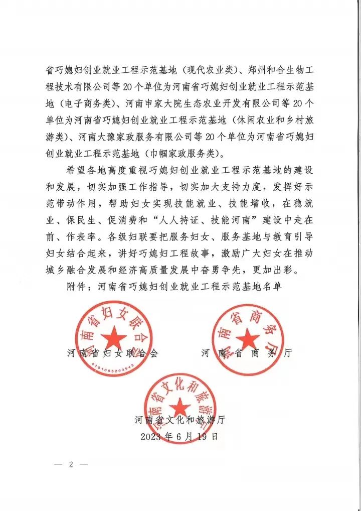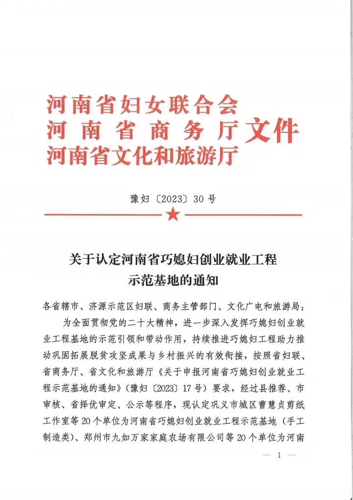 喜报!我县阳光(河南)服饰科技有限公司被认定为省级巧媳妇创业就业工程示范基地