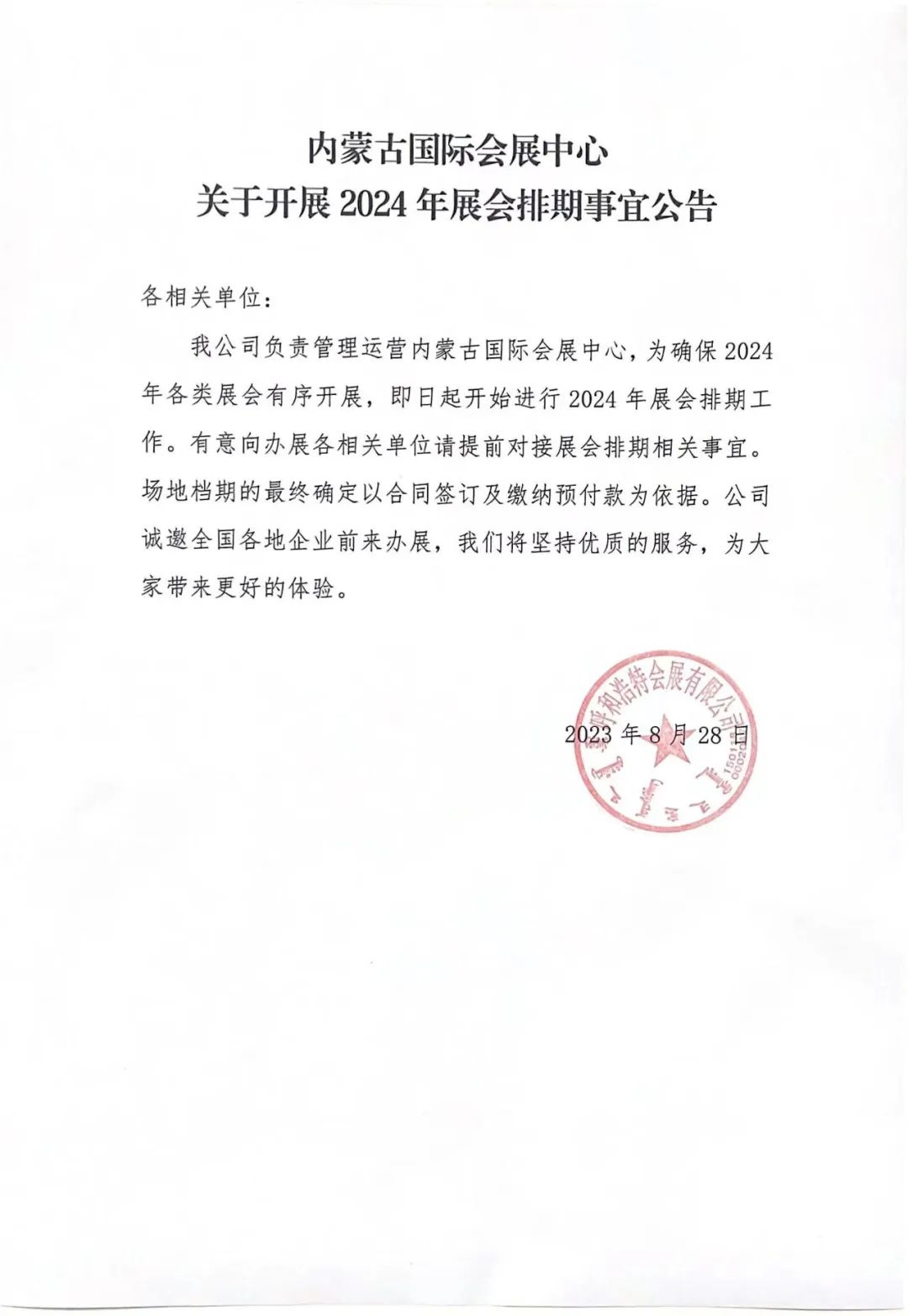 内蒙古国际会展中心关于开展2024年展会排期事宜公告