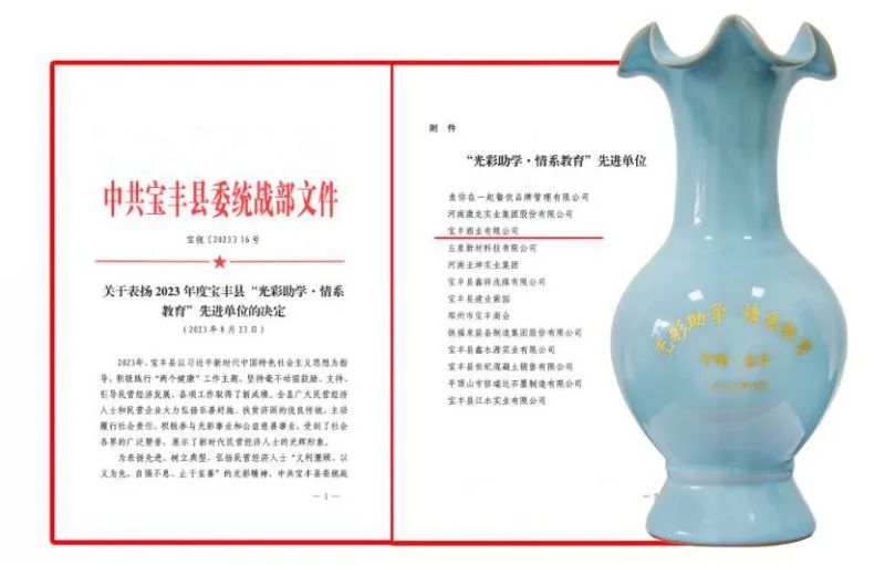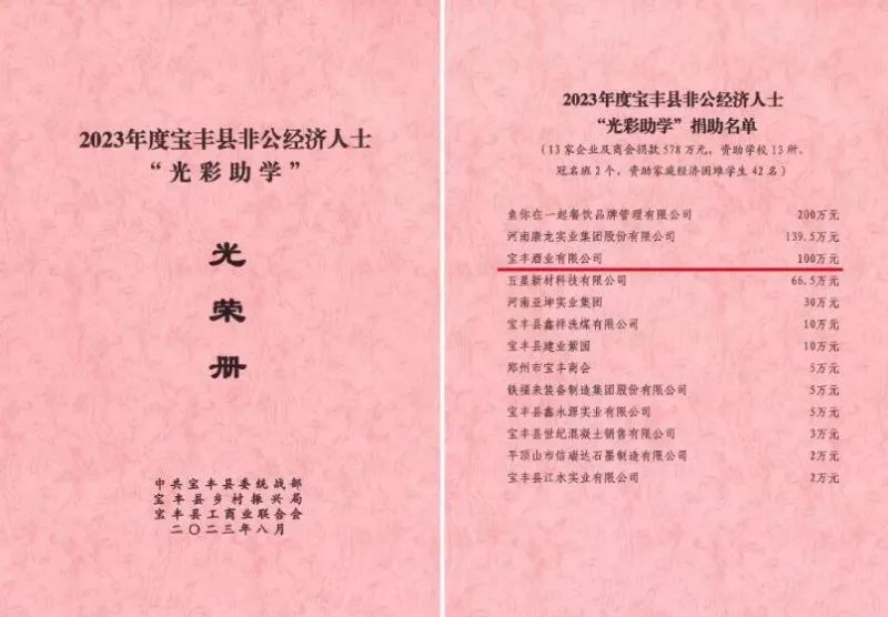 会议宣读了关于表扬2023年度宝丰县“光彩助学·情系教育”先进单位的决定等相关文件,宝丰酒业再度荣获“光彩助学·情系教育”先进单位荣誉称号。