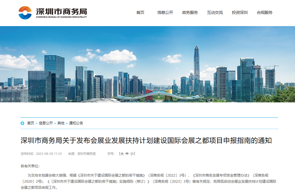 8月29日,深圳市商务局启动会展业发展扶持计划建设国际会展之都项目申报工作并发布相关通知。