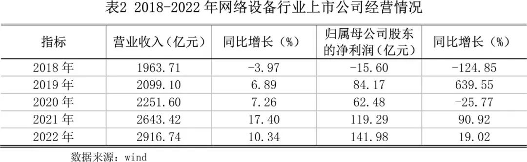 在国家大力支持的背景下,近年来我国网络设备市场规模整体呈增长趋势,根据wind概念类指标显示,网络设备行业共有上市企业18家,2022年行业营业总收入为2916.74亿元,同比增长10.34,增速较上年下降7.06个百分点;行业净利润为141.98亿元,同比增长19.02%,增速较上年下降71.9个百分点。