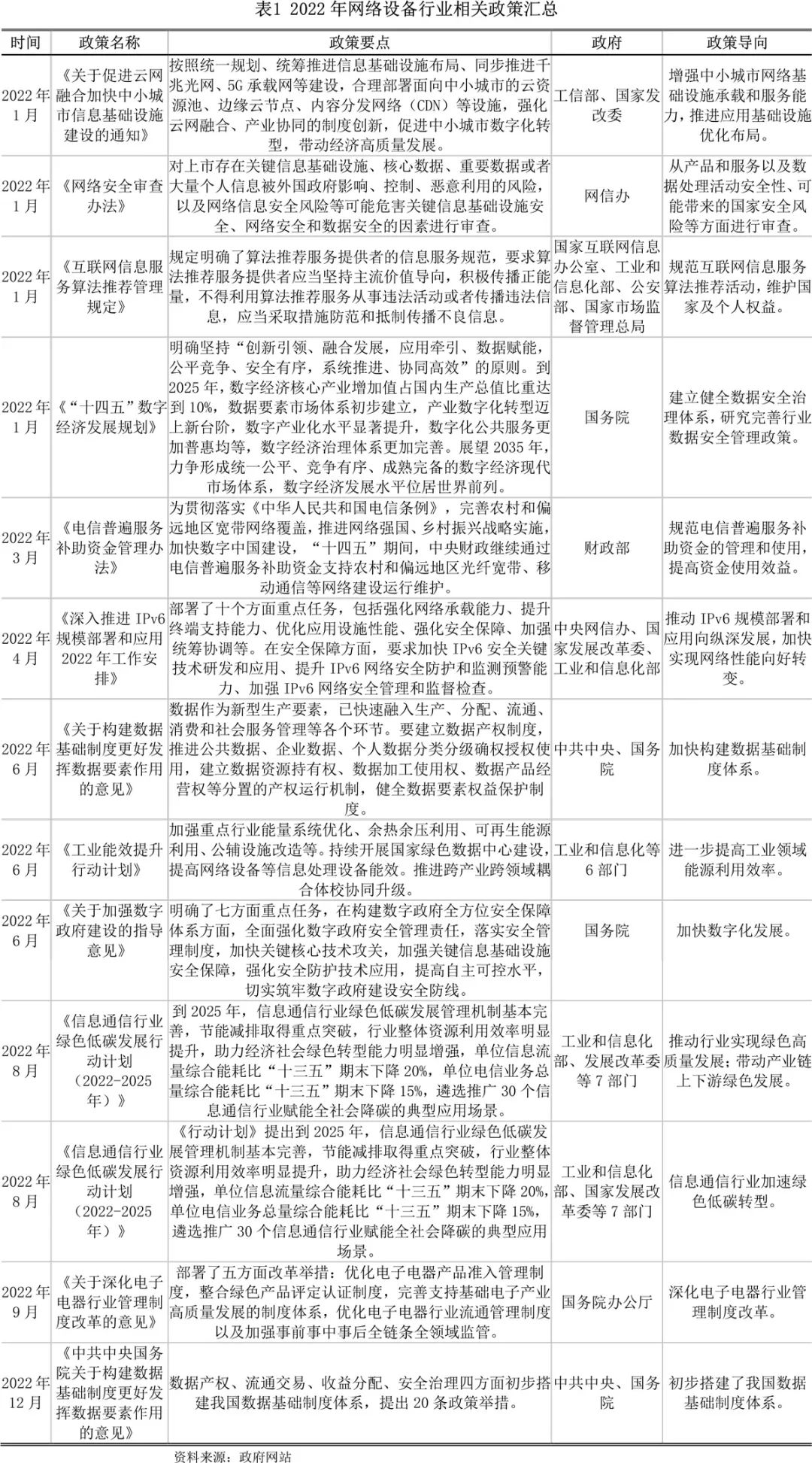 2022年,涉及网络设备行业的国家政策陆续出台,一方面,政策推动基础设施建设,进一步丰富信息通信产品供给。另一方面,行业数据安全管理日益受到重视。此外,绿色低碳理念融入网络设备制造,提高网络设备行业研发制造水平。