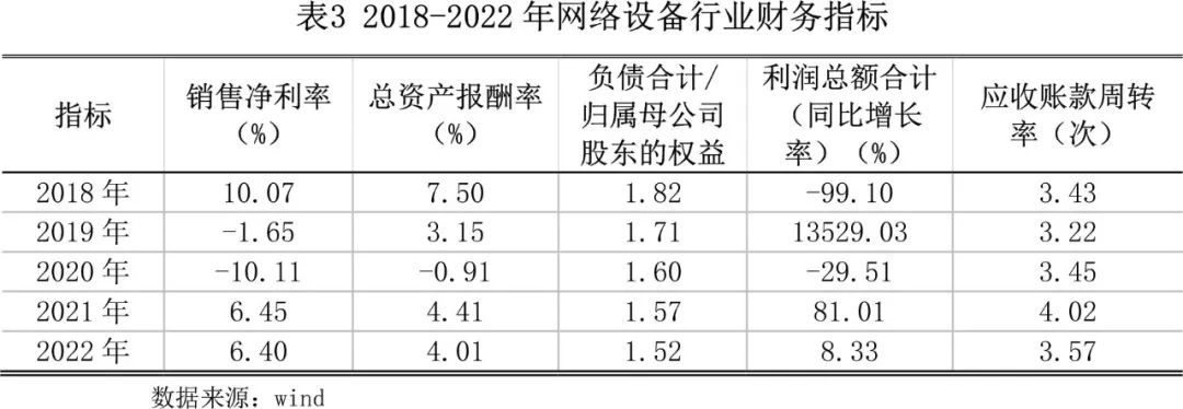 网络设备行业盈利能力、偿债能力、发展能力、以及营运能力表现一般,较上年同期有所下降,但总体保持平稳发展。2022年销售净利率6.40%,较上年小幅下降0.05个百分点;总资产报酬率4.01%,较上年下滑0.4个百分点。负债合计/归属母公司股东的权益1.52倍,较上年下降0.05倍。利润总额增长率8.33%,较上年增加下降72.68个百分点。应收账款增长率3.57次,较上年下降0.45次。