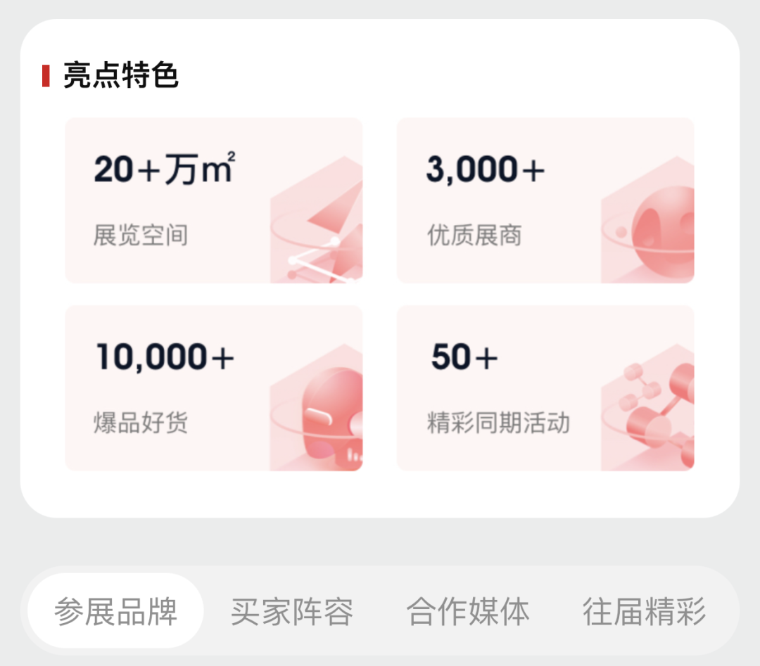包含展馆分布图、亮点特色、参展品牌、买家阵容、合作媒体、往届精彩等;