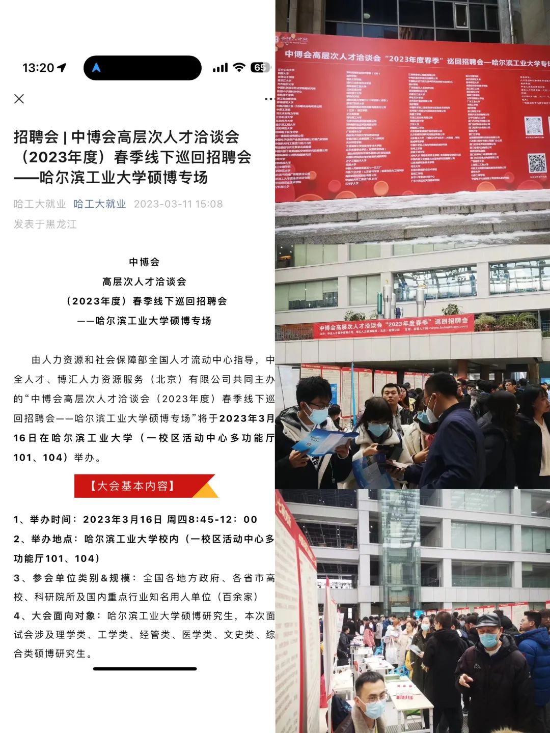 由人力资源和社会保障部全国人才流动中心指导,中全人才、博汇人力资源服务(北京)有限公司共同主办的“中博会高层次人才洽谈会(2023年度)秋季线下巡回招聘会——哈尔滨工业大学硕博专场”将于2023年9月4日在哈尔滨工业大学校内(一校区活动中心多功能厅101、104)举办。