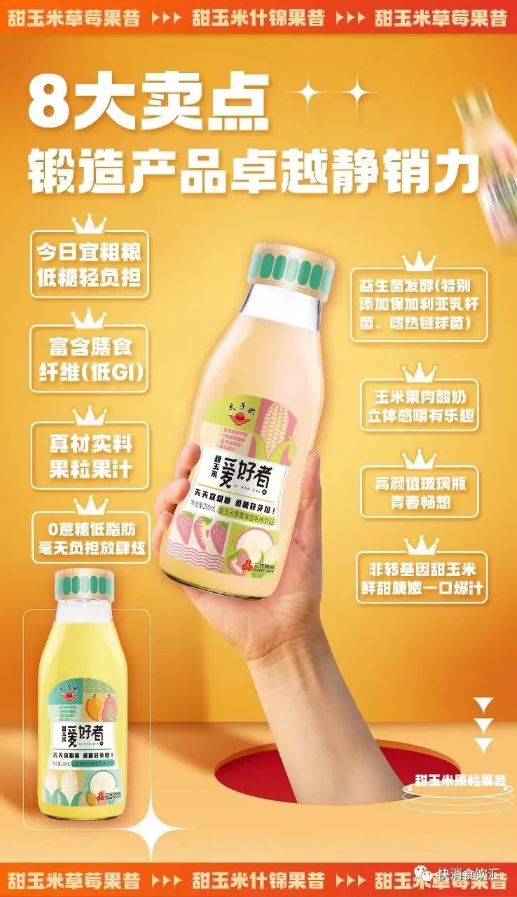 ①天天宜粗粮 ,低糖轻负担②富含膳食纤维(低GI)③益生菌发酵(特别添加保加利亚乳杆菌、嗜热链球菌)④真材实料果粒果汁⑤0蔗糖低脂肪(毫无负担放肆炫)⑥玉米果肉酸奶(立体口感嚼有乐趣)⑦高颜值玻瓶青春畅享 ⑧非转基因甜玉米(鲜甜脆嫩一口爆汁)。
