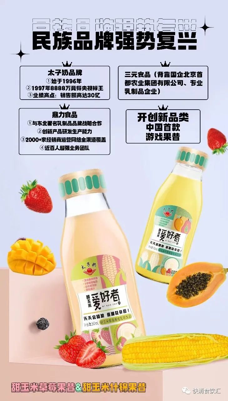 产品介绍:太子奶品牌强势复兴,产品卖点突出,8大卖点锻造产品卓越静销力,营销模式创新:开创新品类——中国首款游戏果昔。