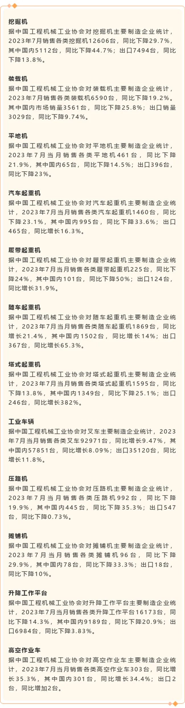 2023年7月工程机械行业十二大类产品销售快报
