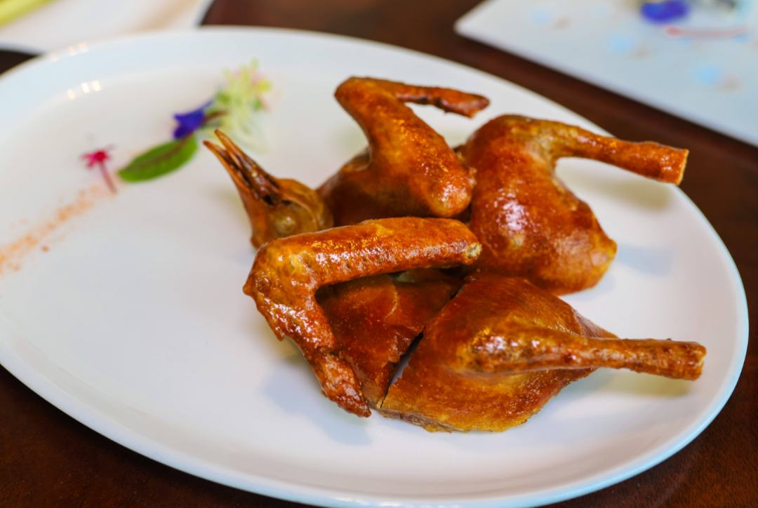 香米饭、红烧乳鸽、西红柿炒鸡蛋