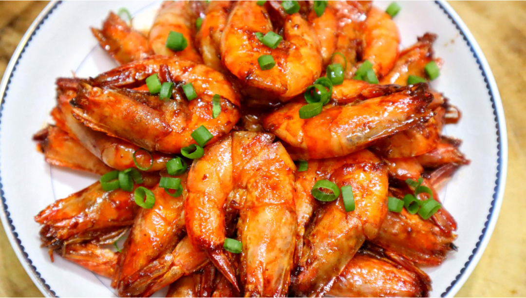 南瓜米饭、油焖大虾、莲藕炒肉片