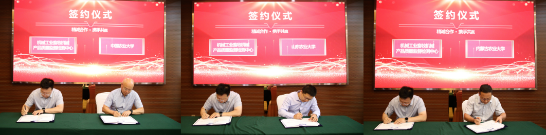 会议上,机械工业畜牧机械产品质量监督检测中心与中国农业大学、山东农业大学、内蒙古农业大学举行了签约仪式并签署“战略合作协议”,在畜牧机械检验检测方面、科技成果评价和农业机械科学技术奖申报方面、科研项目联合申报方面、制修订畜牧机械团体标准方面等四方面达成共识,并将开展深度合作。