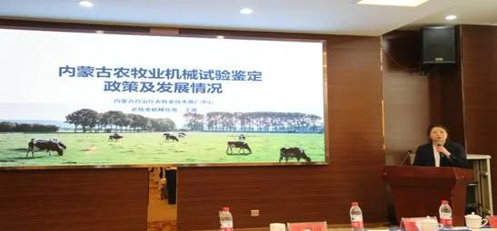 内蒙古自治区农牧业技术推广中心王靖作了《内蒙古农牧机械试验鉴定政策及发展情况》专题报告,深入讲解了内蒙古畜牧机械试验鉴定的相关政策,介绍了整个推广鉴定流程。