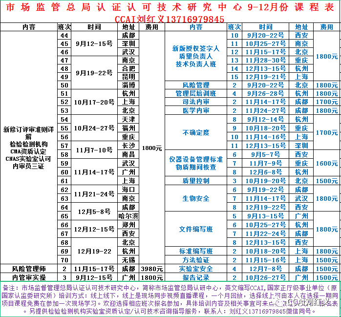 附:我中心9-12月份课程表,需要时可以选择参加我认研中心CCAI 《内审员》《授权签字人质量负责人技术负责人》《不确定度》《仪器设备管理期间核》《内审和管理评审实操》《体系文件编写》等培训班,具体时间参看下表相应班次,报名联系人:刘红义13716979845微信同号