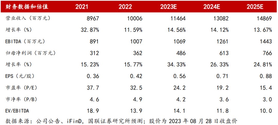 我们预计公司2023-2025年营业收入分别为 114.64/ 130.82/ 148.69亿元(原值为 125.18/ 147.86/ 170.78亿元),同比增速分别为 14.56%/ 14.12% / 13.67%,归母净利润分别为 4.86/ 6.13/ 7.66亿元(原值为 5.37/ 6.54/ 8.31亿元),同比增速分别为 34.33%/ 26.33%/ 24.81%,EPS分别为 0.56/ 0.71/ 0.88元/股,3年CAGR为28%。鉴于公司持续推进五年战略规划,收入稳健增长,利润率显著改善。参照可比公司估值,我们给予公司2023年31倍PE,目标价17.36元,维持“买入”评级。