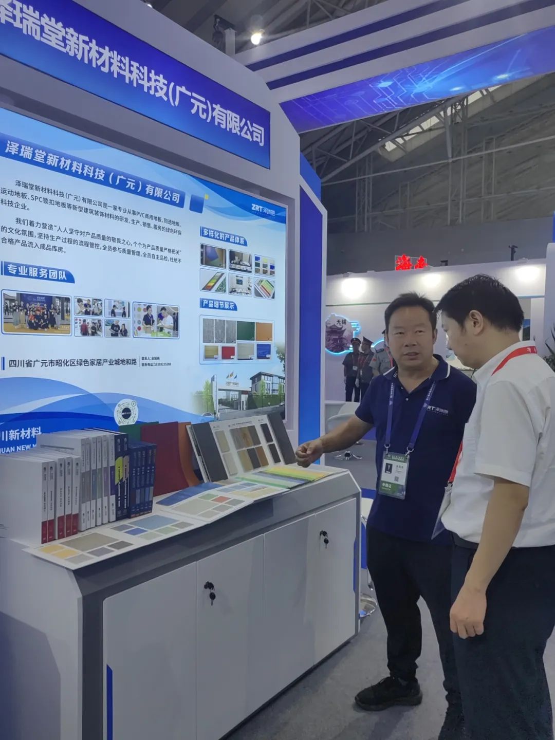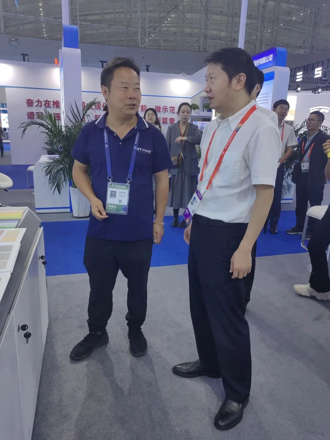 作为参展省份之一的四川,在这次活动中也特别积极,四川省政府工作人员从前期活动准备,到目前展会如约举行,都为各参展企业提供了“保姆式”服务,这让参展企业参享受到了真正的便利。虽然今天已经是展会第二天了,但是政府工作人员依旧坚守在展会一线。下午展会现场参观客商接踵而来,我们四川省泽瑞堂新材料科技(广元)有限公司的展位上,有幸迎来了四川省经信厅副厅长曾吉明领导等一行人的到来,泽瑞堂董事长刘志平先生及工作人员全程陪同。曾副厅长听取了刘志平董事长对工厂产品相关情况的汇报,随即表示对未来新材料领域的发展信心十足,希望我们泽瑞堂工厂能够抓住机遇,凝心聚力,真抓实干,在新材料领域能够交出一份满意的答卷!