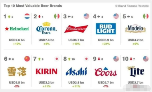 莫德罗(Modelo Especial)排在榜单第5,品牌价值42亿美元。来自墨西哥的啤酒品牌,啤酒口感饱满有层次,保留大麦风味的同时又不乏清爽平衡;百威昕蓝(Bud Light) 排在榜单第4,品牌价值59亿美元。蓝色作为品牌色,将年轻有型的蓝色和品牌调性相结合,充分展现了百威昕蓝自信、玩味、富有创造力的品牌态度。是北美市场最受欢迎的啤酒之一。百威(Budweiser)排在榜单第3,品牌价值67亿美元。1876年在美国诞生,以严谨的工艺自然发酵,低温储藏而酿成在发酵过程中,使用山毛榉木发酵工艺使啤酒格外清爽,是全球销量最多的啤酒之一;科罗娜(Corona)排在榜单第2,品牌价值74亿美元。由墨西哥的莫德罗啤酒公司生产,以其独特的口味成为最畅销的墨西哥啤酒。遵循传统的“海浪式”连续发酵技术和双温酿造工艺,让口感更顺滑。2023全球啤酒品牌价值榜单第1名是喜力(Heineken),品牌价值76亿美元,折合人民币约553亿元,今年排名上升两位。诞生于1873年的荷兰阿姆斯特丹,历经百余年风雨洗礼,喜力现已成为风靡全球190多个国家及地区的国际化啤酒品牌。自然纯净的全麦芽酿造使啤酒麦香馥郁,选用上乘酒花形成细腻丰富的泡沫,让酒液始终保持新鲜口感。在过去的一年里,喜力啤酒品牌实现销量549万千升,同比增长12.5%,主要市场在欧洲和美洲。来源:柳先说等网络公开信息整理。版权归原作者及原出处所有,如涉及版权等问题,请及时与我们联系删除。