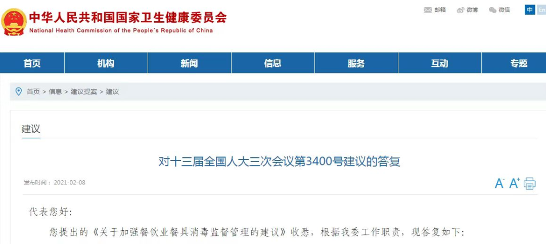 您提出的《关于加强餐饮业餐具消毒监督管理的建议》收悉,根据我委工作职责,现答复如下: