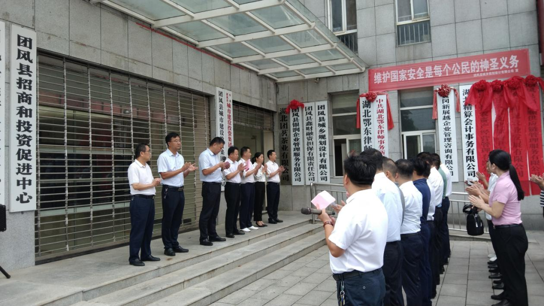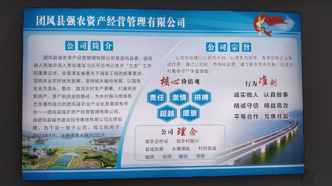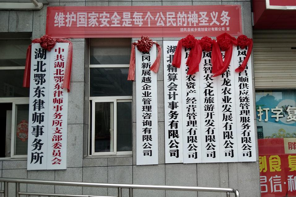 资本大厦一楼右侧一旁,用红布遮掩的四个农业产业平台公司的匾牌格外耀眼,分别是团风县强农资产经营管理有限公司、团风县祥龙农业发展有限公司、团风县福昌顺供应链管理有限公司、团风县智农文化旅游开发有限公司。县领导为四个农业产业平台公司揭牌
