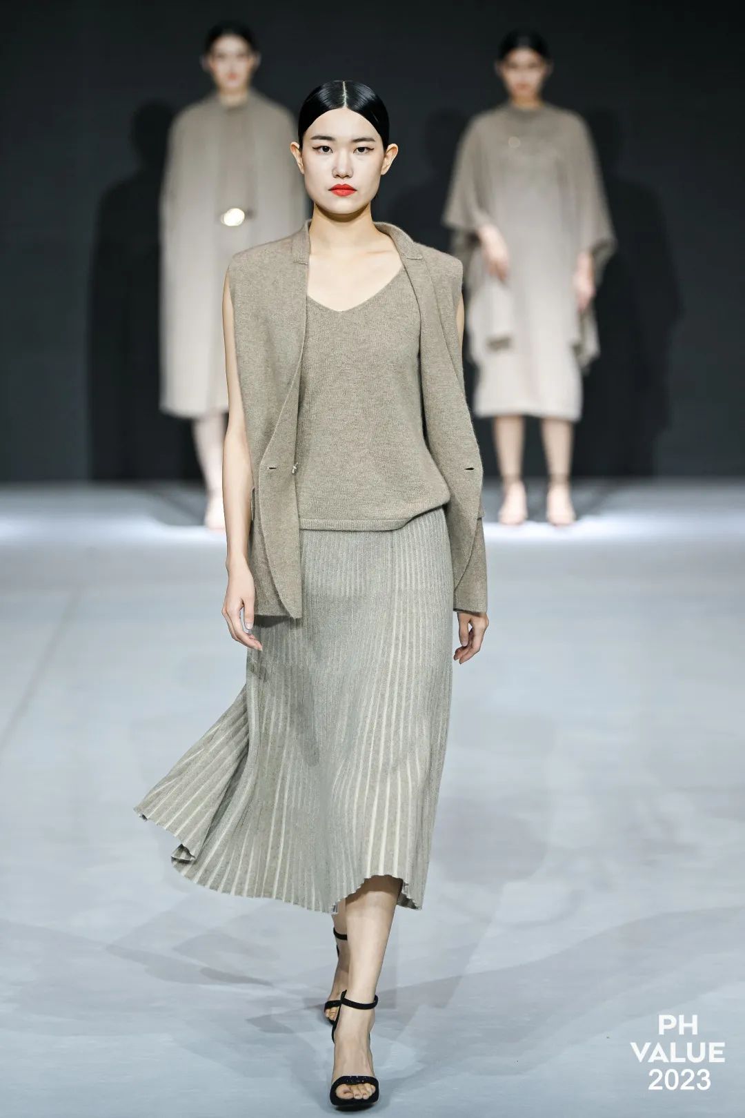 其中,衣尚羊绒作为本届PH Value秋冬针织展的重点展商之一,也吸引着不少观众从秀场直接奔赴衣尚羊绒展位3V055。衣尚羊绒是河北泰兴羊绒纺织有限公司旗下自主品牌。公司以羊绒原料起家,秉承着对大自然的敬畏与时尚事业的热爱,向大众全面推广羊绒原料,拥有专属牧场(内蒙、新疆)50万亩,历经30年打造,成为从牧场-原材料-染色-纺纱-研发-设计-成衣生产-后整理-智能制造的纵向一体化的羊绒产业服务商。旗下“衣尚”品牌创立于2010年,专注于高端材质,100%纯山羊绒、100%桑蚕丝、丝羊绒产品、拉毛纱山羊绒系列,致力于打造时尚、高品质、高颜值的轻奢女装。