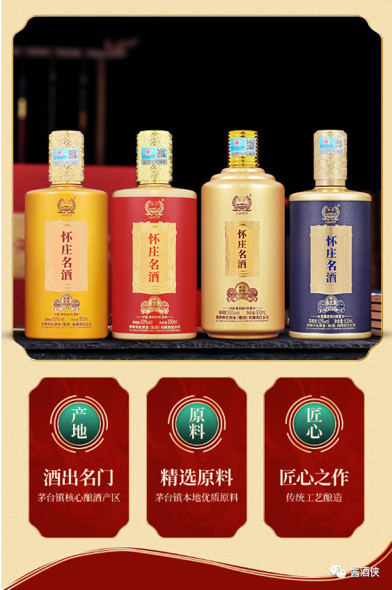 怀庄人以“诚信酿造未来·和谐发展怀庄”为理念,以茅台镇本地糯高粱,黔北优质冬小麦为原料,严格按照茅台镇酱香型白酒传统工艺,产品畅销全国市场并出口东南亚部分国家和地区,深受消费者好评。