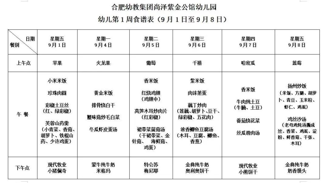 【紫幼·小食光】合肥幼教集团尚泽紫金公馆幼儿园第一周食谱