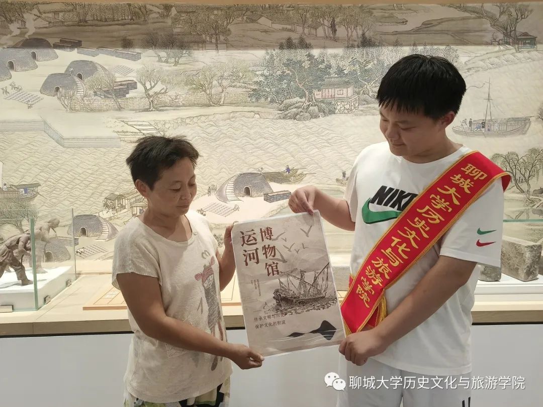 活动伊始,为进一步理解聊城本地的运河史,志愿者在运河博物馆中通过工作人员对展品的讲解进行记录与拍摄。随后,志愿者利用所做展板,以宣讲的方式向群众讲述聊城当地的运河发展历程。明清时期聊城被誉为“漕挽之咽喉,天都之肘腋”,为当时运河沿线九大商埠之一,大运河描画了聊城,绘就聊城的悠长文韵、连绵胜景。最后,志愿者通过与群众的互动交流,分发宣传册与小礼物,增加群众运河博物馆的感知和了解程度。