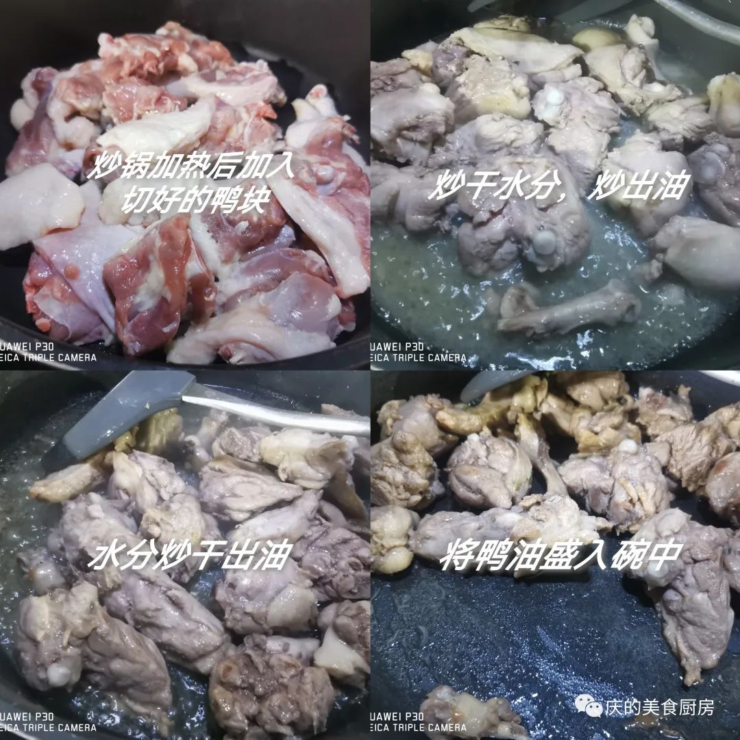 2、炒锅烧热,不加油,直接将鸭肉倒入炒锅中,中小火翻炒将鸭肉的水分和油脂炒出,将多余的油脂盛入碗中,加入一块火锅底料和生姜,翻拌均匀加入一罐啤酒,煮沸后尝下咸淡,加入老抽上色,盖上盖子焖炖1小时,待锅中还有少许汤汁,加入辣椒圈,待辣椒炒熟,大火收干汤汁,即可出锅装盘,撒上葱花点缀一下,一道啤酒鸭就做好了。